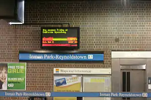 Inman Park / Reynoldstown is a train station in Atlanta, Georgia, serving the Blue Line of the Metropolitan Atlanta Rapid Transit Authority (MARTA) rail system. It also serves the Green Line on weekdays, and has two side platforms and two tracks. This station opened June 30, 1979.