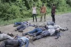 ![]() Maggie Greene, Bob Stookey, and Sasha Williams put down the remaining prison newcomers, after they have been killed. | |