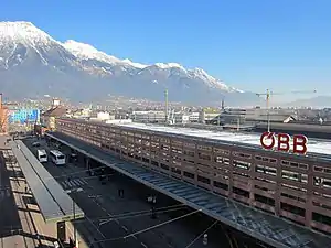 Innsbruck Hauptbahnhof (German for Innsbruck Main Station or Central Station[1]) is the main railway station in Innsbruck, the capital city of the Austrian federal state of Tyrol.[2] Opened in 1853, the station is a major hub for western and central Austria. In 2019, it was the 8th-busiest station in the country, and the 2nd-busiest outside of Vienna after only Linz Hauptbahnhof, with 315 train movements and 38,500 passengers daily.[3]