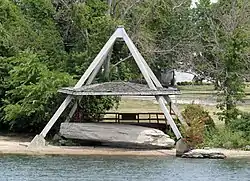 Inscription Rock is a large slab of limestone measuring approximately 32 by 21 feet located on the south shore of Kelleys Island in Lake Erie in Erie County, Ohio. It is situated near the intersections of E Lakeshore Drive and Addison Rd under a large shelter structure with a viewing platform and is open to the public. The rock was listed on the National Register of Historic Places in 1973 and was also located near a series of crescent shaped mounds thought to be created by Pre-Columbian peoples. More mounds were documented to be on the island[2] and another rock with inscriptions was located on the north shore of the island. Unlike Inscription Rock, this boulder was granite - likely a glacial erratic - and engraved with two upside-down figures.[3] However now only Inscription Rock remains since island quarry workers dynamited the petroglyph rock on the north shore.[4]