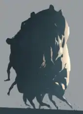 The Huddle, the amalgam of body parts that the player controls at the end of the game, had been an idea for the game since 2010, when animator Andreas Normand Grøntved had been brought aboard Playdead to do preliminary animations for it based on a drawing by artist Morten Bramsen.[23] Bramsen's drawing of the Huddle served to guide much of the visual nature and art style for the rest of the game.[23] To animate it, Grøntved took inspiration from the motion of Nago the demon form of the boar god from Princess Mononoke, the squishiness of the main character of the game Gish, and human behavior during crowd surfing.[23] Grøntved developed initial animations using what he called the Huddle Potato that simplified the geometries to demonstrate how the being would move and interact with the environment.[23] Whereas most of the other game animations were based on a combination of pre-set skeletal movements along with the physics engine, the Huddle had to be animated nearly entirely by a custom physics model developed by Thomas Krog, and implemented by Lasse Jon Fulgsang Pedersen, Søren Trautner Madsen, and Mikkel Bøgeskov Svendsen. This model uses a 26-body simulation of the core of the Huddle, driven by a network of impulses based on the direction of the player and the local environment, which allowed the Huddle to reconfigure itself as it needed in certain situations, such as fitting into tight spaces.[23] They then added six arms and six legs with some pre-set animations that would also help to drive the impulse in the main body simulation.[23] The skin of the huddle was a mix of art styles borrowed from the sculptures of John Isaacs, and the art of Jenny Saville and Rembrandt.[23] The vocals and bodysounds were performed by the renowned Danish-Austrian performance group SIGNA.[24]