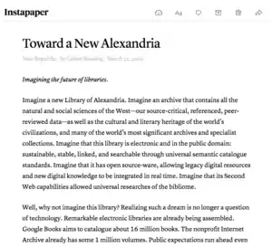 Instapaper can be used via a web-based interface, or through mobile apps for Android and iOS. Within a web browser, a "Read Later" bookmarklet can be used to save pages to a user's personal unread queue on Instapaper. Every article is automatically reformatted to remove excessive formatting and graphics.[13]