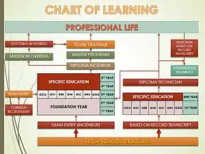 The Institut de Technologie du Cambodge (ITC) is one of Cambodia's higher education institutions.[2] It offers education and research programs in engineering. Programs are offered in French and English.