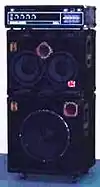 A 2 x 10" bass speaker cabinet stacked on top of a 15" cabinet, with separate bass amplifier "head" unit