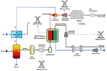 Lower-temperature fuel cell types such as the proton exchange membrane fuel cell, phosphoric acid fuel cell, and alkaline fuel cell require pure hydrogen as fuel, typically produced from external reforming of natural gas. However, fuels cells operating at high temperature such as the solid oxide fuel cell (SOFC) are not poisoned by carbon monoxide and carbon dioxide, and in fact can accept hydrogen, carbon monoxide, carbon dioxide, steam, and methane mixtures as fuel directly, because of their internal shift and reforming capabilities.[1] This opens up the possibility of efficient fuel cell-based power cycles consuming solid fuels such as coal and biomass, the gasification of which results in syngas containing mostly hydrogen, carbon monoxide and methane which can be cleaned and fed directly to the SOFCs without the added cost and complexity of methane reforming, water gas shifting and hydrogen separation operations which would otherwise be needed to isolate pure hydrogen as fuel. A power cycle based on gasification of solid fuel and SOFCs is called an Integrated Gasification Fuel Cell (IGFC) cycle; the IGFC power plant is analogous to an integrated gasification combined cycle power plant, but with the gas turbine power generation unit replaced with a fuel cell (high temperature type such as SOFC) power generation unit.[2] By taking advantage of intrinsically high energy efficiency of SOFCs and process integration, exceptionally high power plant efficiencies are possible. Furthermore, SOFCs in the IGFC cycle can be operated so as to isolate a carbon dioxide-rich anodic exhaust stream, allowing efficient carbon capture to address greenhouse gas emissions concerns of coal-based power generation.