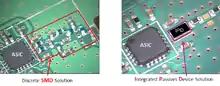 Integrated passive devices (IPDs), also known as integrated passive components (IPCs) or embedded passive components (EPC), are electronic components where resistors (R), capacitors (C), inductors (L)/coils/chokes, microstriplines, impedance matching elements, baluns or any combinations of them are integrated in the same package or on the same substrate. Sometimes integrated passives can also be called as embedded passives,[1][2] and still the difference between integrated and embedded passives is technically unclear.[3][4] In both cases passives are realized in between dielectric layers or on the same substrate.