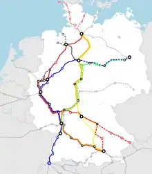 - line 5 (blue): Dortmund – Hagen – Wuppertal-Elberfeld (– Solingen-Ohligs) – Cologne – Bonn – Koblenz – Mainz – Frankfurt Airport – Frankfurt (Main) (– Aschaffenburg) – Würzburg – Nuremberg – Augsburg – Munich