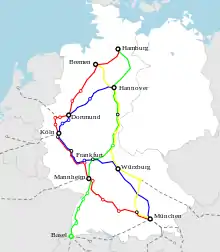 - line 1 (red): Hamburg-Altona – Bremen – Osnabrück – Münster (Westf) – Dortmund – Bochum – Essen – Duisburg – Düsseldorf – Köln – Bonn – Koblenz – Wiesbaden – Frankfurt (Main)