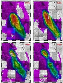 InSAR can be used in a variety of volcanic settings, including deformation associated with eruptions, inter-eruption strain caused by changes in magma distribution at depth, gravitational spreading of volcanic edifices, and volcano-tectonic deformation signals.[11] Early work on volcanic InSAR included studies on Mount Etna,[12] and Kilauea,[13] with many more volcanoes being studied as the field developed. The technique is now widely used for academic research into volcanic deformation, although its use as an operational monitoring technique for volcano observatories has been limited by issues such as orbital repeat times, lack of archived data, coherence and atmospheric errors.[14][15] Recently InSAR has been used to study rifting processes in Ethiopia.[16]