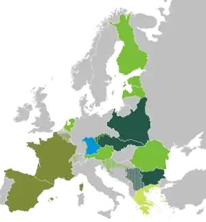 The concept of a "Green International" in the service of peasant interests dates back to the 1900s: in 1905, an Italian Socialist Party newspaper voiced hopes that such a movement would be formed around the International Institute of Agriculture.[1] In 1907, an International Confederation of Agricultural Associations was formed in the German Empire, but it failed to survive World War I. It was later partly revived as a Pan-German Peasants' Association, which received memberships from the Low Countries and Scandinavia.[2] The notion of a "Green International" was again explored during the early interwar period, being embraced by Georg Heim of the Bavarian People's Party (BVP). From late 1918, at a height of a revolutionary upheaval in Europe in 1918, Heim worked on the unification of "peasant and conservative forces from all countries."[3] His effort only touched the former Central Powers and countries that had been neutral in World War I: a conference at Berlin in mid 1919 had delegates from Weimar Germany, German Austria, Hungary, and the Netherlands; Swiss and Belgian politicians sent messages of support, although the Dutch delegation itself remained skeptical about the possibility of Heim's movement being successful.[4]