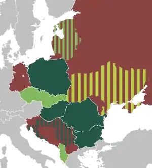 Agrarian initiatives were sabotaged from 1933 by Nazi Germany, whose leadership viewed the entirety of Central Europe as a German Lebensraum.[81] The Bloc of Agrarian Countries held its last conference in Bucharest in June 1933, after which it faded away due to the hostility of great powers and a lack of commitment among Polish statesmen.[82] Although Italy participated in the 1931 Grain Conference, which was a triumph for the small agrarian states,[83] its fascist government singled out peasant internationalists as crucial enemies. In 1934, as part of the Italo–German rapprochement, it maneuvered to have Hungary withdraw from the Bloc of Agrarian Countries.[81] In December of the following year, a piece in Corriere della Sera alleged that a continental conspiracy, comprising both the Red and Green Internationals, was set out to destroy Italy, and, through it, "the order of Europe".[84]