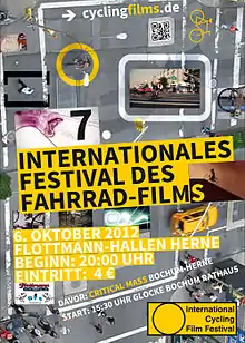 Since a continuous growth by an increasing number of participants and a rising variety and quality of film contributions[5] the festival was renamed "International Cycling Film Festival” 2009. Also the festival's venue “Goldkante” became too small for the audience over the years. Based on the existing cooperation to the Theater Kohlenpott the makers of the festival decided to move the 4th International Cycling Film Festival to Herne 2009. From then until now the festival takes place at the Flottmann-Hallen, a former machine-tool factory, which was transformed into a cultural centre for Herne following its closure in 1983. During the years 2010 to 2012 the ICFF was included in the “VVicycle- Herne Film and Bicycle Days”, an organizational umbrella for different film festivals taking place in the Flottmann-Hallen.[6][7][8]
