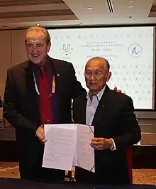 2015 SportAccord Convention in Sochi marked a following milestone for IMFA. International University Sports Federation (FISU) has officially recognised muaythai signing the agreement between FISU and IFMA. IFMA President Dr. Sakchye Tapsuwan and FISU delegate Claude-Louis Gallien (President) signed collaboration convention with the international governing body of muaythai. Dr. Sakchye Tapsuwan expressed his satisfaction that IFMA is now a partner of FISU, while President Gallien stressed the importance of sports and friendship.