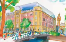 Queen Juliana offered to house ISS in the Noordeinde Palace in The Hague in 1951. At first, ISS was perceived as a teaching institute, although by 1954 ISS was aiming to become research and teaching driven.[9] Due to the role ISS played in creating the European Association of Development Institutes (EADI), and its focus on research and academic quality, the Institute received its formal rights to award the PhD in the 1970s.[9] From 1993 onward, the ISS has been located in the former headquarters of the Netherlands Post and Telecommunications (the PTT) on the Kortenaerkade.[10]