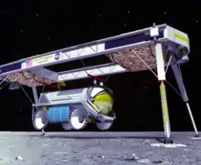 The Moon Bus would have been a large rover designed to accommodate 2 passengers for days or weeks at a time. At least two of these rovers would be positioned at the temporary outpost and would act as crew quarters and mobile labs. The 4-person crew would divide into teams of 2, each stationed to one rover, and would depart the outpost on separate missions. The rovers would also be used as early habitation before the outpost was assembled [3]