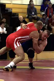 Frank Workman (US), tries to take down Aydin Polatci (Turkey), 130-kg Free-Style. 19th World Military Wrestling Championship (CISM), Camp Lejeune, North Carolina.