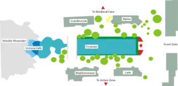 Located at the end of International Street, and considered entirely part of International Festival in the early years, Wonder Mountain appeared in the park's logo from 1981 to 2006, until Cedar Fair took ownership. Particularly in the early years, when sightlines in the park were longer, the mountain served as a navigation tool to establish one's position within the park.[7]