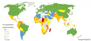In 1981, 60% of the world population (2.73 billion people) had an income of less than $2.50 per day and 42% of the world population (1.91 billion people) had an income of less than $1.25 per day. As of 2005, these numbers had reduced to 43% and 21.5% respectively.[47] In 2002, the proportion of poor people (earning less than $3,470 per year) was 78%, while the proportion of rich people (earning more than $8,000/year) was 11%.[48]