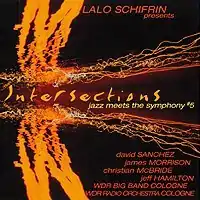 Intersections: Jazz Meets the Symphony #5 is an album by Argentine composer, pianist and conductor Lalo Schifrin with a jazz quintet, the WDR Big Band, and the WDR Radio Orchestra of Cologne recorded in 2000 and released on the Aleph label in 2001. The AllMusic review of the album noted that only Duke Ellington and Woody Herman had previously combined a big band with a symphony orchestra.[1] Joining Schifrin in the quintet were James Morrison on trumpet, fluegelhorn, and trombone, David Sánchez on soprano and tenor saxes, Christian McBride on bass, and Jeff Hamilton on drums. The album, the fifth in Schifrin's highly acclaimed "Jazz Meets the Symphony" series, was recorded before live audiences at two concerts in the Klaus-Von-Bismarck-Saal in Cologne, Germany, and an edited version was later broadcast on WDR radio and television.[2]