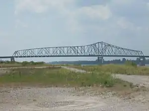 After the passage of the Federal Aid Highway Act of 1956, which authorized the Interstate Highway System, officials in Missouri, Tennessee, Kentucky, and Illinois began an effort to improve connectivity between the four states, which included a westward extension of I-24 from its allocated terminus in Nashville to southern Illinois. Governors John M. Dalton of Missouri and Buford Ellington of Tennessee announced on January 30, 1962, a proposal for a new interstate highway between I-55 in Hayti and I-40 in Jackson, Tennessee, incorporating the bridge.[7] On September 17, 1963, the governors of the four states met with President John F. Kennedy where they reached an agreement on the alignment for the I-24 extension and endorsed the routing for the Hayti-to-Jackson interstate highway.[8] On August 18, 1964, the Bureau of Public Roads, the predecessor agency to the Federal Highway Administration, authorized an interstate highway between Hayti and Dyersburg, which was named I-155, as well as the I-24 extension. However, they did not give approval to the entire proposed route.[9][10]