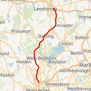 I-190 begins at a southern terminus with I-290 in Worcester. Near the Greendale Mall, there is an interchange with Route 12 before the highway passes along the eastern shore of Indian Lake and continues through the northern points of Worcester. In West Boylston, I-190 has another interchange with Route 12 before turning northwest into Holden. The freeway later crosses the Quinapoxet River. The freeway curves to the northeast reentering West Boylston. I-190 intersects Route 140 and Route 12 another time in Sterling. In Lancaster, I-190 has an exit for Route 117. North of Johnny Appleseed State Park and Lancaster State Forest, I-190 merges and terminates at Route 2 and Mechanic Street in the city of Leominster.[2]