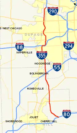 Interstate 355 (I-355), also known as the Veterans Memorial Tollway, is an Interstate Highway and tollway in the western and southwest suburbs of Chicago in the U.S. state of Illinois. Like most other toll roads in the northeastern portion of the state, I-355 is maintained by the Illinois State Toll Highway Authority (ISTHA). I-355 runs from I-80 in New Lenox north to I-290 in Itasca,[1] a distance of 32.5 miles (52.3 km).[lower-alpha 1] With the exception of a four-mile (6.4 km) expansion in 2009, from U.S. Route 34 (US 34, Ogden Avenue) to 75th Street, the highway is six lanes wide for its entire length.[2]
