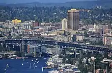 I-5 continues north out of downtown Seattle under a 20-to-30-foot (6.1 to 9.1 m) retaining wall along Melrose Avenue at the edge of Capitol Hill.[46] To the west is the South Lake Union and Cascade neighborhoods, accessed via ramps to Stewart Street and Mercer Street. The freeway travels along the north end of Capitol Hill through the Eastlake neighborhood on the east side of Lake Union, passing over the I-5 Colonnade mountain bike park.[47] At Roanoke Park, I-5 intersects the western terminus of SR 520, a major freeway that crosses Lake Washington on the Evergreen Point Floating Bridge to Bellevue and Redmond.[25] The heavily trafficked Mercer Street and SR 520 exits use ramps that are on opposite sides of the freeway, causing vehicles to weave across several lanes that contributes to traffic congestion.[48][49] I-5 continues onto the Ship Canal Bridge towards the University District, crossing 160 feet (49 m) over a section of the Lake Washington Ship Canal and Eastlake Avenue parallel to the University Bridge. The bridge also includes a lower deck for the express lanes, with a ramp connecting to Northeast 42nd Street in the University District.[50][51]