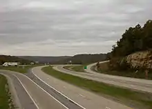 The final segment of I-64 to be completed was between Sam Black Church and the West Virginia Turnpike near Beckley.[2] This revised Interstate alignment traverses through an entirely rural area with extremely rugged terrain. Opened in 1988, this final portion is 38 miles (61 km) long and costed approximately $300 million (equivalent to $578 million in 2020[3]) to construct, making it one of the most expensive segments of Interstate Highway in the United States at $7.8 million per mile ($4.8 million/km) (equivalent to $15 million per mile ($9.3 million/km) in 2020[3]). It has some extremely rugged terrain, with one segment boasting a seven-percent grade downhill eastbound for seven miles (11 km) at Sandstone Mountain. Anticipating loss of braking situations, two emergency truck escape ramps were built to be used by runaway trucks. These emergency ramps were used with such frequency that, in addition to large warning signs alerting truckers to the steep grade, a special truck speed advisory system was installed to automatically weigh each truck and indicate the speed at which it should begin the downhill section.