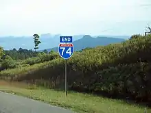 The 12.6-mile (20.3 km) portion from south of Steeds north to south of Ulah was completed August 27, 1996, and was the first road marked as I-74 (and I-73).[24] Future signage was also installed north to the Greensboro area.[25] The remainder of the 26 miles (42 km) of existing and new freeway between Ulah and Candor was also signed as I-73/I-74 along US 220. In 1998, NC 752, a freeway spur of I-77 was renumbered as the segment of completed I-74, from I-77 to US 601. On June 30, 1999, the freeway was extended an additional five miles (8.0 km) to US 52, south of Mount Airy. In April 2001, I-74 was overlapped with I-77 from the Virginia state line to exit 101.