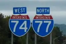 Interstate 74 (I-74) is a partially completed part of the Interstate Highway System that will eventually run from Davenport, Iowa, to Myrtle Beach, South Carolina. In the US state of North Carolina, I-74 currently exists in three distinct segments; from I-77 at the Virginia state line to U.S. Highway 52 (US 52) near Mount Airy, from I-40 in Winston-Salem to US 220 near Ellerbe, and from US 74 and US 74 Business (US 74 Bus.) near Maxton to US 74/North Carolina Highway 41 (NC 41) near Lumberton. I-74 has an extensive concurrency with I-73 from Randleman to Ellerbe in the Piedmont. When completed, I-74 will link the cities of Mount Airy, Winston-Salem, High Point, Rockingham, Laurinburg, and Lumberton.