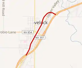 BL-80 begins at the West Lovelock interchange with Interstate 80 and U.S. Route 95, concurrent with SR 396. The route follows Cornell Avenue north into the center of the town. The highway crosses Main Street (SR 398) and continues along Cornell Avenue to its end at a five-point intersection with 14th Street, Airport Road (SR 856) and Upper Valley Road near the Lovelock city limits. The highway heads northeast concurrent with SR 856 as Airport Road, crossing over Upper Valley Road, an irrigation canal, and the Union Pacific Railroad tracks before ending at a half-interchange with Interstate 80 and U.S. Route 95.[2]