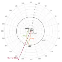 The baseline launch would be in 2036 using a Space Launch System in its Block 2 configuration, featuring an additional Centaur and Star 48BV booster. This launch would put the probe on a direct trajectory to Jupiter, and after a mere seven months the probe would make a gravity assist to speed out at about 95 km/s.[1] Alternative trajectories include bringing the Star 48 booster for a burn upon closest approach; one trajectory involving that burn at Jupiter with a slightly longer transit time, and another with about the same transit time, but passing ahead of Jupiter for a dive down near the Sun for an even faster escape trajectory.[1]