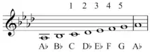 There is a one-to-one correspondence between staff positions and diatonic-scale degrees (the notes of diatonic scale).[lower-alpha 4] This means that interval numbers can also be determined by counting diatonic scale degrees, rather than staff positions, provided that the two notes that form the interval are drawn from a diatonic scale. Namely, C–G is a fifth because in any diatonic scale that contains C and G, the sequence from C to G includes five notes. For instance, in the A-major diatonic scale, the five notes are C–D–E–F–G (see figure). This is not true for all kinds of scales. For instance, in a chromatic scale, the notes from C to G are eight (C–C–D–D–E–F–F–G). This is the reason interval numbers are also called diatonic numbers, and this convention is called diatonic numbering.
