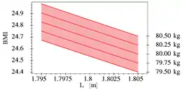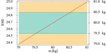 Height and body weight both affect the value of the BMI. We have already treated weight as an uncertain measurement, but height is also subject to uncertainty. Height measurements in metres are usually rounded to the nearest centimeter: a recorded measurement of 1.79 metres actually means a height in the interval . Now, all four combinations of possible height/weight values must be considered. Using the interval methods described below, the BMI lies in the interval