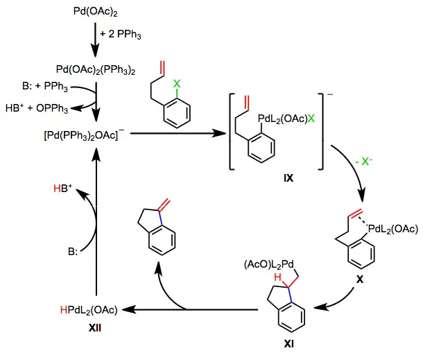 Reactions involving palladium(II) acetate and phosphine ligands proceed by a third mechanism, the anionic pathway.[8] Base mediates the oxidation of a phosphine ligand by palladium(II) to a phosphine oxide. Oxidative addition then generates the anionic palladium complex IX. Loss of halide leads to neutral complex X, which undergoes steps analogous to the neutral pathway to regenerate anionic complex IX. A similar anionic pathway is also likely operative in reactions of bulky palladium tri(tert-butyl)phosphine complexes.[9]