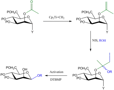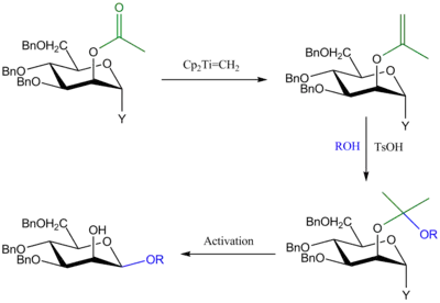 In this method, the glycosyl donor is protected at the C-2 position by an OAc group. The C-2-OAc protecting group is transformed into an enol ether by the Tebbe reagent (Cp2Ti=CH2), and then the glycosyl acceptor is tethered to the enol ether under acid-catalysed conditions to generate a mixed acetal. In a subsequent step, the β-mannoside is formed upon activation of the anomeric leaving group (Y), followed by work up.[2]