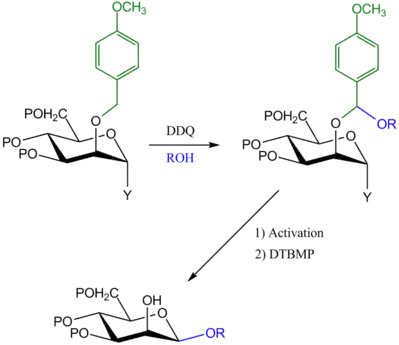 In this method, the glycosyl donor is protected at C-2 by a para-methoxybenzyl (PMB) group. The glycosyl acceptor is then tethered at the benzylic position of the PMB protecting group in the presence of 2,3-Dichloro-5,6-dicyano-1,4-benzoquinone (DDQ). The anomeric leaving group (Y) is then activated, and the developing oxocarbenium ion is captured by the tethered aglycon alcohol (OR) to give 1,2-cis β-glycoside product.[5]