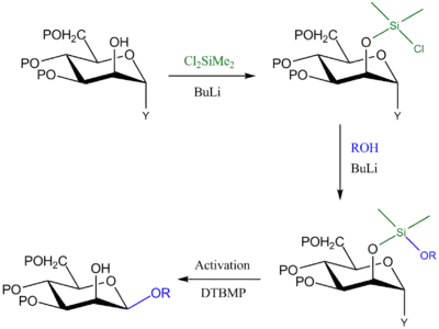 The initial step in this method involves the formation of a silyl ether at the C-2 hydroxy group of the glycosyl donor upon addition of dimethyldichlorosilane in the presence of a strong base such as butyllithium (BuLi); then the glycosyl acceptor is added to form a mixed silaketal. Activation of the anomeric leaving group in the presence of a hindered base then leads to the β-glycoside.[7]