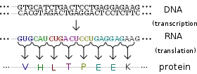 The information in DNA is held in the sequence of the repeating units along the DNA chain.[8] These units are four types of nucleotides (A,T,G and C) and the sequence of nucleotides stores information in an alphabet called the genetic code. When a gene is read by a cell the DNA sequence is copied into a very similar molecule called RNA (this process is called transcription). Transcription is controlled by other DNA sequences (such as promoters), which show a cell where genes are, and control how often they are copied. The RNA copy made from a gene is then fed through a structure called a ribosome, which translates the sequence of nucleotides in the RNA into the correct sequence of amino acids and joins these amino acids together to make a complete protein chain. The new protein then folds up into its active form. The process of moving information from the language of RNA into the language of amino acids is called translation.[9]