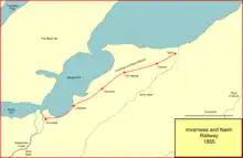 There were stations serving Inverness, Culloden, Dalcross, Fort George, Cawdor (not open at first, but only after a delay) and Nairn. The Inverness station had a single platform 20 yards long.[5] At Inverness there was a westward extension passing the station and running to a riverside location adjacent to Shore Street, reached at first by a wagon turntable. It was horse-operated.[note 1][10][5] The train service consisted of four trains each way daily, reduced to three daily from 1 December; the journey time was 45 minutes.[7] A goods service was started on 1 December 1855, including on the Harbour branch, but it was poorly patronised. Nevertheless the passenger service was very buoyant, and it was decided to order additional carriages to handle the anticipated extra traffic in the summer.[11][12][5]