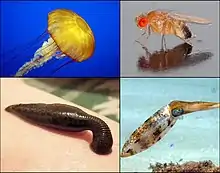 | Examples of invertebrates from different phyla; clockwise from top-left: Chrysaora fuscescens (a cnidarian), Drosophila melanogaster (an arthropod), Caribbean reef squid (a mollusk), and Hirudo medicinalis (an annelid). | |