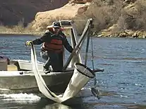 Drift can service freshwater invertebrates by giving them an escape route from predation, or the use of a current to disperse progeny downstream.[2] On occasion, however, invertebrates will inadvertently lose their footing, and drift downstream. For that, invertebrates counter a stream’s flow through physical and behavioral adaptations.[3] And just as invertebrates adapted to stabilize themselves in the water column, or use the stream’s energy to their advantage, so too have predators adapted to catch invertebrates as they drift. Species of fish, commonly salmonids, catch drifting insects during the peak times after dusk, and before dawn.[4] Fishermen can exploit this relationship using fly fishing techniques and lures that mimic drifting insects to catch these fishes.[5]