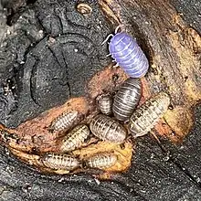 Invertebrate iridescent virus 31 (IIV-31), also known informally as isopod iridovirus, is a species of invertebrate iridescent virus in the genus Iridovirus.[2] Oniscidea (commonly known by a variety of names such as 'potato bugs', 'woodlice', 'pill bugs', 'slaters', 'rolly polies', etc.) serve as hosts. Infection is associated with decreased responsiveness in the host, increased mortality, and most strikingly, the emergence of an iridescent blue or bluish-purple colour due to the reflection of light off a paracrystalline arrangement of virions within the tissues.[3]