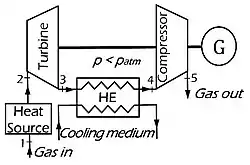 Incoming air may be heated up in the combustion chamber, in the heat exchanger, or the system may directly receive hot exhaust gas from an engine or some technological process. Been heated up in one of these ways, the gas expands in the turbine from pressure around the atmospheric to the subatmospheric one, after the turbine, created by the compressor located further in the gas duct. The gas should be cooled down in the heat-exchanger between the turbine and compressor to provide the difference in the work received in the turbine and the work needed for the compressor to maintain the subatmospheric pressure after the turbine. After the compressor, the gas is released to the atmosphere with the pressure close to the atmospheric one. Alternatively, the gas can be cooled down after the compressor again, as it gains some heat in the compression process, and then released. The heat received in the heat-exchangers between the turbine and compressor and after the compressor may be used for heating, providing the cogeneration mode of the system operation. The basic scheme of the IBC and temperature-enthalpy diagram are presented in figures 1 and 2.[4] For external heat sources or high temperature storage systems, the closed process design of the inverted Brayton Cycle is also possible. The overall efficiency can thus be significantly increased.[5]