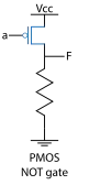 An inverter circuit outputs a voltage representing the opposite logic-level to its input. Its main function is to invert the input signal applied. If the applied input is low then the output becomes high and vice versa. Inverters can be constructed using a single NMOS transistor or a single PMOS transistor coupled with a resistor. Since this 'resistive-drain' approach uses only a single type of transistor, it can be fabricated at a low cost. However, because current flows through the resistor in one of the two states, the resistive-drain configuration is disadvantaged for power consumption and processing speed. Alternatively, inverters can be constructed using two complementary transistors in a CMOS configuration. This configuration greatly reduces power consumption since one of the transistors is always off in both logic states.[1] Processing speed can also be improved due to the relatively low resistance compared to the NMOS-only or PMOS-only type devices. Inverters can also be constructed with bipolar junction transistors (BJT) in either a resistor–transistor logic (RTL) or a transistor–transistor logic (TTL) configuration.