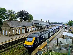 Inverurie railway station is a railway station serving the town of Inverurie, Aberdeenshire, Scotland. It is managed by ScotRail and is on the Aberdeen to Inverness Line, which is mostly single track north of this point. It is also the terminus for some trains on the Edinburgh and Glasgow Lines through Aberdeen as part of the Aberdeen Crossrail project. The station, Category B listed, is single storied and has a cupola with windvane.[4][3] The main building, adjacent to the car park to the west, is on platform 1. Inverurie is a busy station with business travellers and commuters, traveling both to and from Aberdeen.