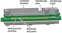 Ion mobility spectrometry (IMS) is an analytical technique used to separate and identify ionized molecules in the gas phase based on their mobility in a carrier buffer gas. Though heavily employed for military or security purposes, such as detecting drugs and explosives, the technique also has many laboratory analytical applications, including the analysis of both small and large biomolecules.[1] IMS instruments are extremely sensitive stand-alone devices, but are often coupled with mass spectrometry, gas chromatography or high-performance liquid chromatography in order to achieve a multi-dimensional separation. They come in various sizes, ranging from a few millimeters to several meters depending on the specific application, and are capable of operating under a broad range of conditions. IMS instruments such as microscale high-field asymmetric-waveform ion mobility spectrometry can be palm-portable for use in a range of applications including volatile organic compound (VOC) monitoring, biological sample analysis, medical diagnosis and food quality monitoring.[2] Systems operated at higher pressure (i.e. atmospheric conditions, 1 atm or 1013 hPa) are often accompanied by elevated temperature (above 100 °C), while lower pressure systems (1-20 hPa) do not require heating.