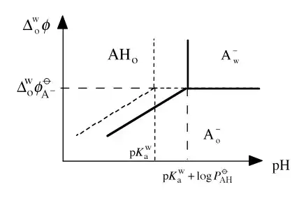 Thus, the separation limit between the anionic form in water and the organic solvent () is a horizontal straight line. As in Pourbaix diagrams, the separation limit between the acid and basic forms in water is a vertical line given by .