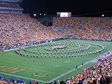 In 2017, Hawkeyes fans created what ESPN called "college football's coolest new tradition". In February of that year, the university's children's hospital, which has long had a close relationship with the Iowa football program, opened a new 12-story building across the street from Kinnick Stadium, with the top few floors featuring an unobstructed view of the playing field.[44] The top floor of the hospital features the Press Box Café, a lounge area with floor-to-ceiling windows facing the field that is reserved for patients and their families on Hawkeyes game days, with big-screen TVs available when Iowa plays on the road.[44][45] Following a suggestion posted to a Hawkeyes fan page on Facebook, by Iowan Krista Young, fans now face the hospital and wave to the children and their families at the end of the first quarter of every home game. For home night games, the first of which was against Penn State on September 23, 2017, "The Wave" features fans waving with their cell phone flashlights turned on.[45] Two weeks after the Penn State game, with the Hawkeyes at home against Illinois, the Hawkeye Marching Band joined in this new tradition, forming a hand moving side-to-side and "waving" at the children during its halftime show.[46] The Wave was even seen in the offseason—on February 15, 2018, inspired by a suggestion from nurses at the children's hospital, the stadium's maintenance crew created a pattern of a waving hand in snow that was covering the playing field. At least one patient was reported to have seen the crew creating the design, and upon completion, the crew went into the Press Box Café to see their final product.[47]