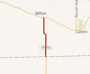 Iowa 15 began as a continuation of Route 15 in Missouri. It headed north through the farmland of Jackson Township, the southwesternmost township in Van Buren County. The highway ran over relatively flat terrain, only undulating approximately 40 feet (12 m) over the length of the route.[2] Near the midpoint of the route, it curves slightly to the west and then continues to the north. It enters the Milton city limits from the south. The highway ends at an intersection with Iowa 2.[3]
